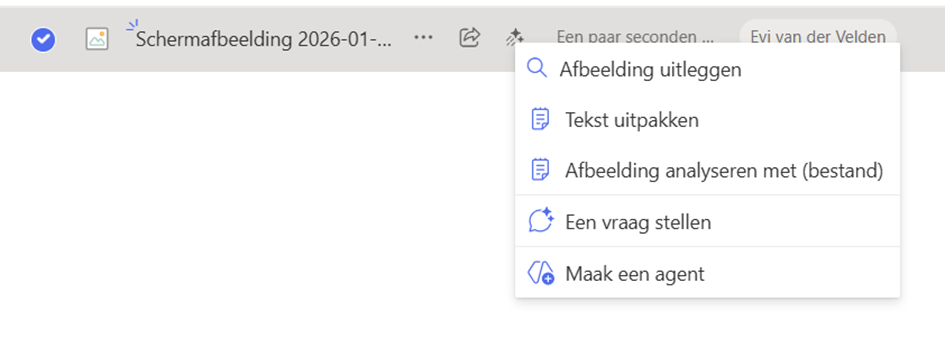 Als je hierop klikt krijg je een overzicht van de AI acties die je op een afbeelding kunt toepassen, denk hierbij aan; een vraag stellen over de afbeelding, een toelichting krijgen op de afbeelding of de afbeelding verder analysen.